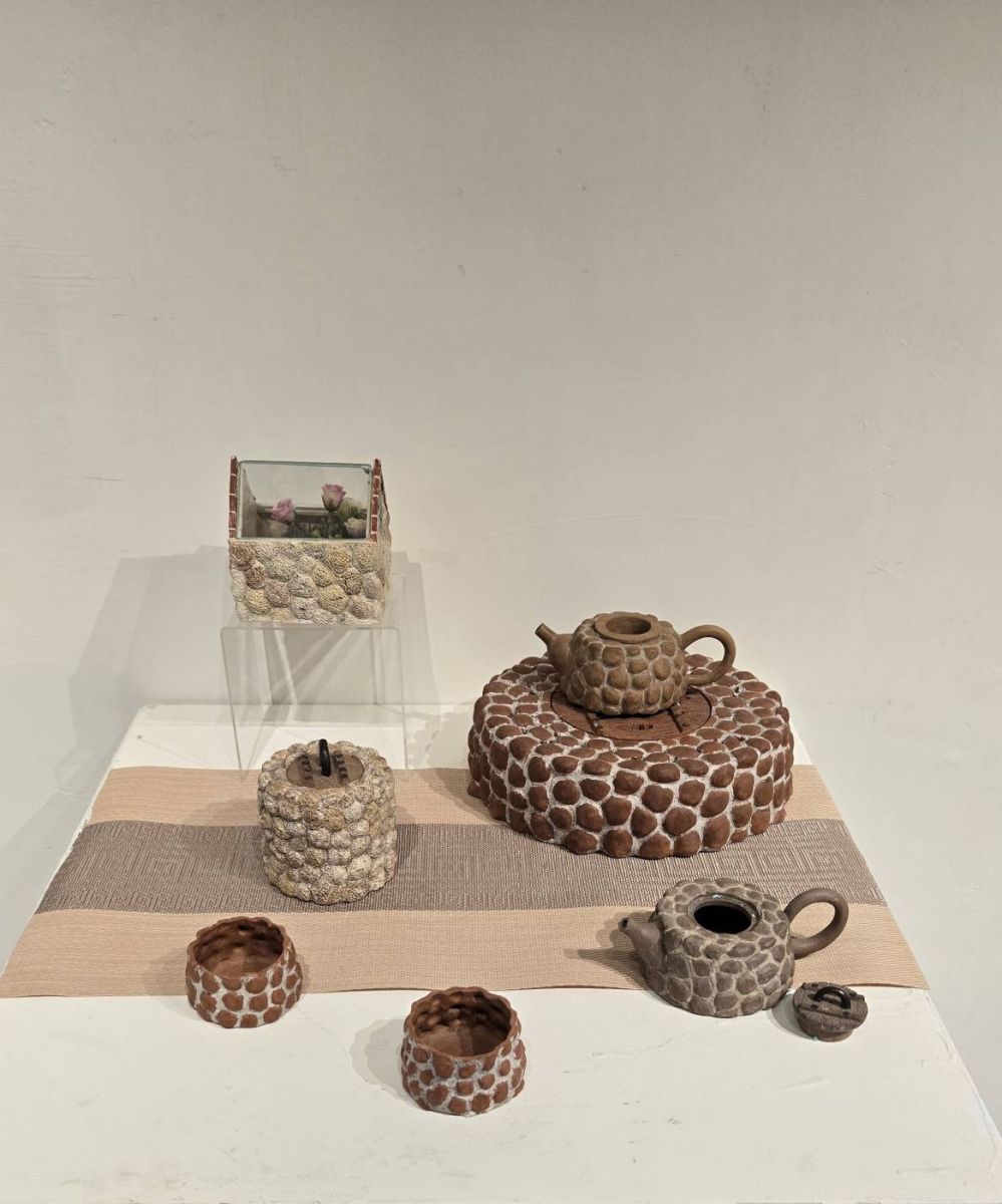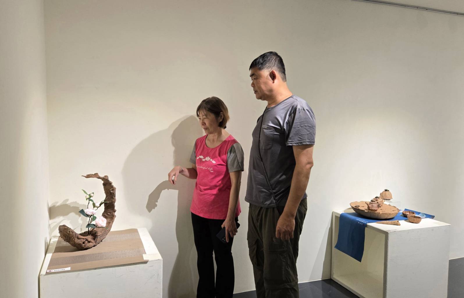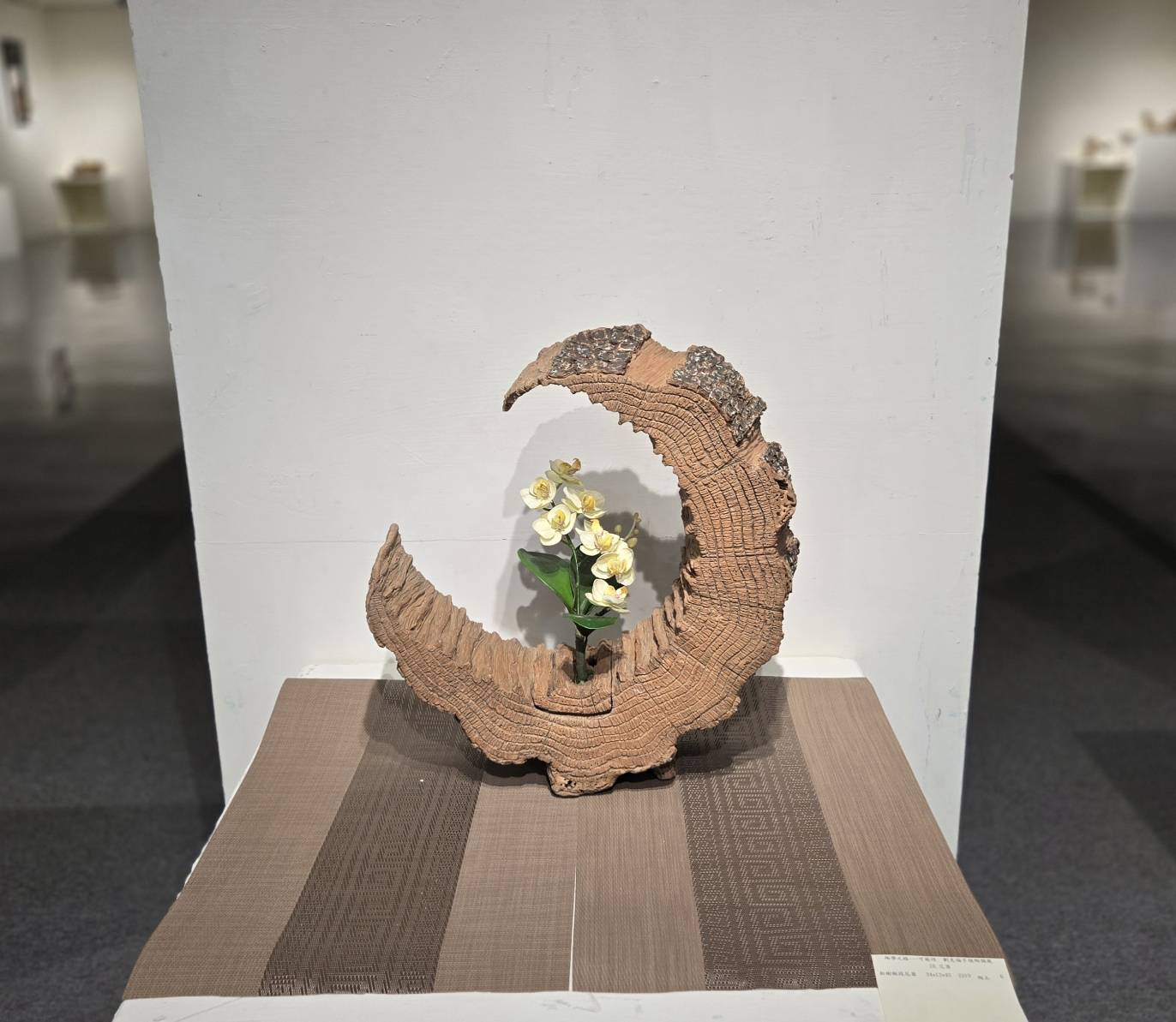 劉克倫補充說,此次展覽分為茶席、花器、盆景與雕塑等4大主題;茶席作品突破傳統圓壺形式,茶壺、茶杯與茶器造型皆不受限制;花器結合池坊自由花精神,部分作品懸掛於牆面,延展創作空間;盆景以細膩觀察老樹歲月刻痕,搭配多媒材呈現真柏、梅樹與榕樹之美;雕塑作品則展現夜燈、石紋與仿木雕造型等多樣表現。