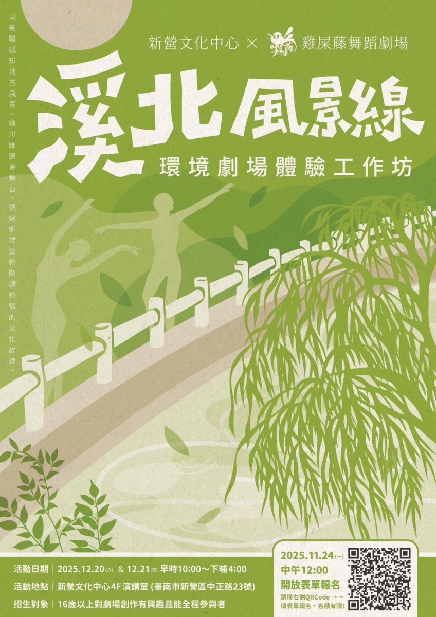以「溪北風景線」為題,邀請參與者以身體感知地方風景,透過劇場重新閱讀新營的文化紋理。工作坊將以新營文化中心旁的「綠川廊道」為主要活動場域。「綠川廊道」為嘉南大圳新營支流,連接新營火車站與新營文化中心,我們規劃讓參與學員們以「綠川廊道」為舞台,延伸出融合地景與河域流動概念之環境劇場。課程結合走讀、即興表演與場域創作,引導學員在真實空間中探索歷史、河域與人之間的關係。